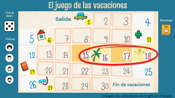 Cada jugador elegirá una ficha y quién saque un 5 saldrá primero.En cada turno se tirará el dado y, después de ver la propuesta de la casilla, tendrá que realizar una acción determinada o tomar la mejor decisión para poder sobrevivir a las vacaciones con algo de dinero, ya que quien llegue antes al fin de vacaciones ganará la partida. Comenzaréis con 450€ y tendréis que saber administrarlos bien, ya que si os quedáis sin nada tendréis que pedir dinero al banco. Para que el banco os preste 50€, tendréis que perder un turno. En cada tirada tendréis que apuntar en la libreta las decisiones que toméis o lo que os ha pasado, ya que cuando acabe el juego compartiréis con el resto de compañeros y compañeras de clase cómo han sido vuestras vacaciones en el juego. ¡Mucha suerte!