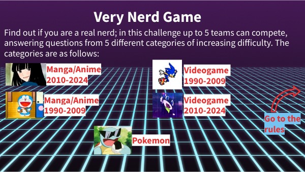 Find out if you are a real nerd; in this challenge up to 5 teams can compete, answering questions from 5 different categories of increasing difficulty. The categories are as follows: