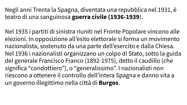 Negli anni Trenta la Spagna, diventata una repubblica nel 1931, è teatro di una sanguinosa guerra civile (1936-1939). Nel 1935 i partiti di sinistra riuniti nel Fronte Popolare vincono alle elezioni. In opposizione all’esito elettorale si forma un movimento nazionalista, sostenuto da una parte dell’esercito e dalla Chiesa. Nel 1936 i nazionalisti organizzano un colpo di Stato, sotto la guida del generale Francisco Franco (1892-1975), detto il caudillo (che significa “condottiero”), o “generalissimo”. I nazionalisti non riescono a ottenere il controllo dell’intera Spagna e danno vita a un governo illegittimo nella città di Burgos.