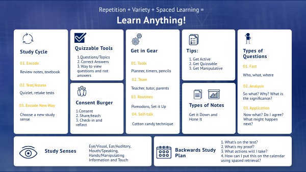 1. What's on the test?2. What's my proof? 3. What actions will I take? 4. How can I put this on the calendar using spaced retrieval?