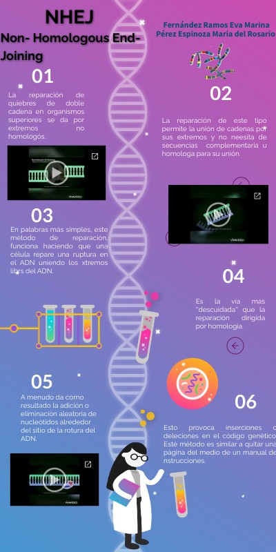 En palabras más simples, este método de reparación, funciona haciendo que una célula repare una ruptura en el ADN uniendo los xtremos librs del ADN.