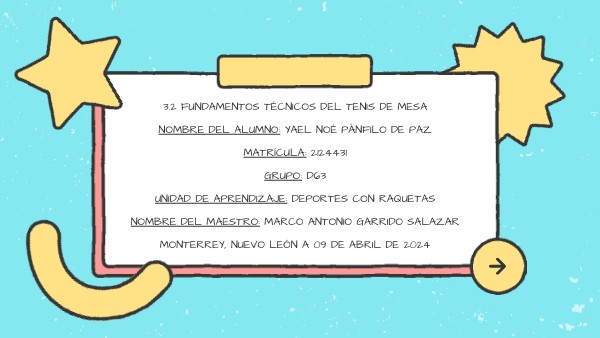 3.2 FUNDAMENTOS TÉCNICOS DEL TENIS DE MESA NOMBRE DEL ALUMNO: YAEL NOÉ PÁNFILO DE PAZ MATRÍCULA: 2124431 GRUPO: D63 UNIDAD DE APRENDIZAJE: DEPORTES CON RAQUETAS NOMBRE DEL MAESTRO: MARCO ANTONIO GARRIDO SALAZAR MONTERREY, NUEVO LEÓN A 09 DE ABRIL DE 2024