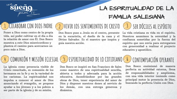 Don Bosco se inspiró en San Francisco de Sales como maestro de una espiritualidad sencilla, abierta a todos y adecuada para la acción educativa. Asomb´rándose por las grandes obras de Dios, tener experiencia del amor de Dios y disponer nuestros dones al servicio de los demás, con una entrega generosa y dinámica.
