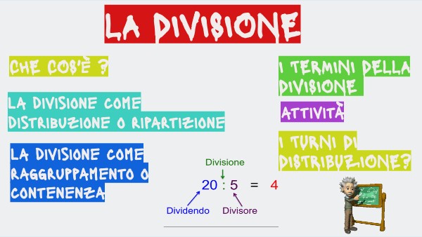 La divisione è una delle 4 operazioni aritmetiche che permette di distribuire o raggruppare una quantità in parti uguali.