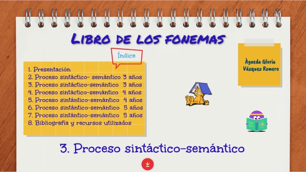 1. Presentación 2. Proceso sintáctico- semántico 3 años 3. Proceso sintáctico-semántico 3 años 4. Proceso sintáctico-semántico 4 años 5. Proceso sintántico-semántico 4 años 6. Proceso sintántico-semántico 5 años 7. Proceso sintántico-semántico 5 años 8. Bibliografía y recursos utilizados