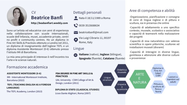 -Organizzazione, pianificazione e consegna di corsi di lingua inglese e di pittura e scultura, sia in presenza che online -Capacità di adattamento a uno specifico contesto, museale, scolastico o assiociativo e capacità di teamwork nella realizzazione dei progetti -Capacità di resa naturalistica con valenza scientifica in opere pittoriche, scultoree ed installazioni museali (diorami) -Capacità di interagire in diverse lingue, gentilezza e attenzione alle diverse culture e provenienze