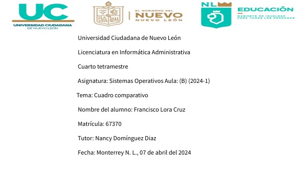 Universidad Ciudadana de Nuevo León Licenciatura en Informática Administrativa Cuarto tetramestre Asignatura: Sistemas Operativos Aula: (B) (2024-1) Tema: Cuadro comparativo Nombre del alumno: Francisco Lora Cruz Matrícula: 67370 Tutor: Nancy Domínguez Diaz Fecha: Monterrey N. L., 13 de abril del 2024