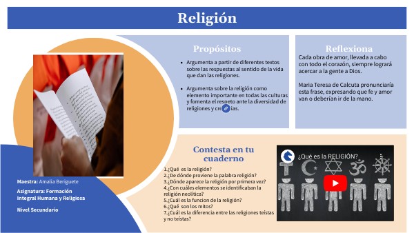 - Argumenta sobre la religión como elemento importante en todas las culturas y fomenta el respeto ante la diversidad de religiones y creencias.