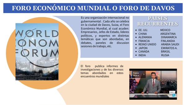 Es una organización internacional no gubernamental . Cada año se celebra en la ciudad de Davos, Suiza, el Foro Económico Mundial, al cual acuden: Empresarios, Jefes de Estado, lideres políticos, y expertos en distintas temáticas que son abordadas, en debates, paneles de discusion sesiones de trabajo, etc.