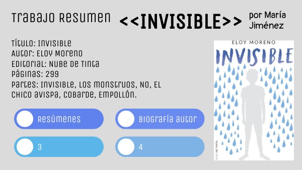 Título: Invisible Autor: Eloy Moreno Editorial: Nube de Tinta Páginas: 299 partes: Invisible, Los monstruos, No, El chico avispa, cobarde, Empollón.