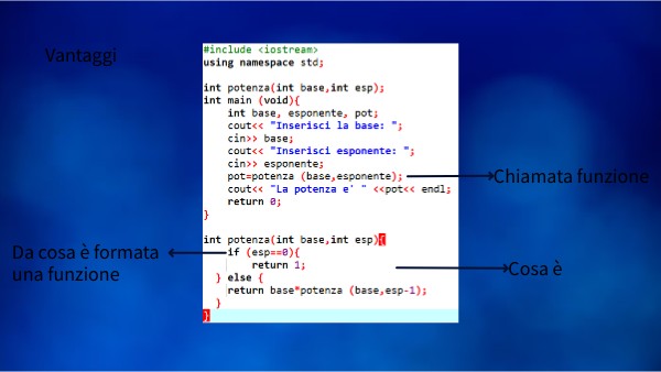 Una funzione è formata da due casi: caso base e il caso ricorsivo Caso base: Il caso base rappresenta il punto di fermata di una funzione. In questo caso il caso base è zero Caso ricorsivo: Rappresenta il caso in cui la funzione si richiama in questo caso (base*potenza (base,esp-1))
