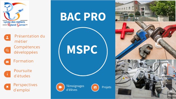Le titulaire du BAC PRO MSPC est un technicien généraliste ayant des connaissances techniques dans différents domaines (mécanique, électrique, pneumatique, automatisme …..) Il assure la maintenance préventive, corrective et améliorative des équipements industriels. Il participe aussi à l’installation et la mise en service de nouveaux matériels. Il est un acteur indispensable au bon fonctionnement de l’outil de production, son activité varie selon l'entreprise qui l'emploie, la nature et la complexité des équipements dont il a la charge. Sa formation généraliste lui permet de travailler dans des secteurs très variés (métallurgie, agro-alimentaire, pharmaceutique, aéronautique, ascenseurs) mais aussi dans des entreprise comme la SNCF, TISSEO ou de Travaux Publics.