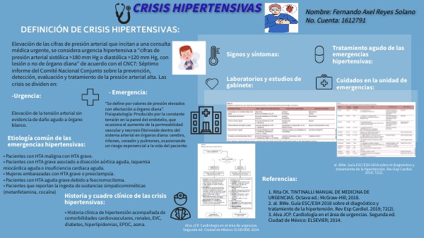 1. Rita CK. TINTINALLI MANUAL DE MEDICINA DE URGENCIAS. Octava ed.: McGraw-Hill; 2018. 2. al. BWe. Guía ESC/ESH 2018 sobre el diagnóstico y tratamiento de la hipertensión. Rev Esp Cardiol. 2019; 72(2). 3. Alva JCP. Cardiología en el área de urgencias. Segunda ed. Ciudad de México: ELSEVIER; 2014.