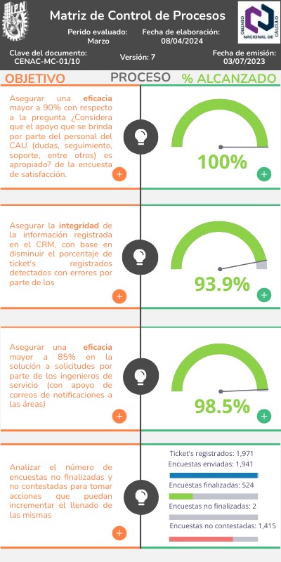 Asegurar una eficacia mayor a 95% con respecto a: * El apoyo que se brinda por parte del personal del CAU * El tiempo de solución por parte del Ingeniero de servicio * La solución brindada por parte del Ingeniero de servicio * El servicio brindado por el CENAC.