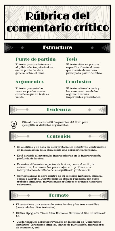 - Examina diferentes aspectos de la obra, como el estilo, la estructura, los temas, los personajes, etc., y ofrece una interpretación detallada de su significado y relevancia.