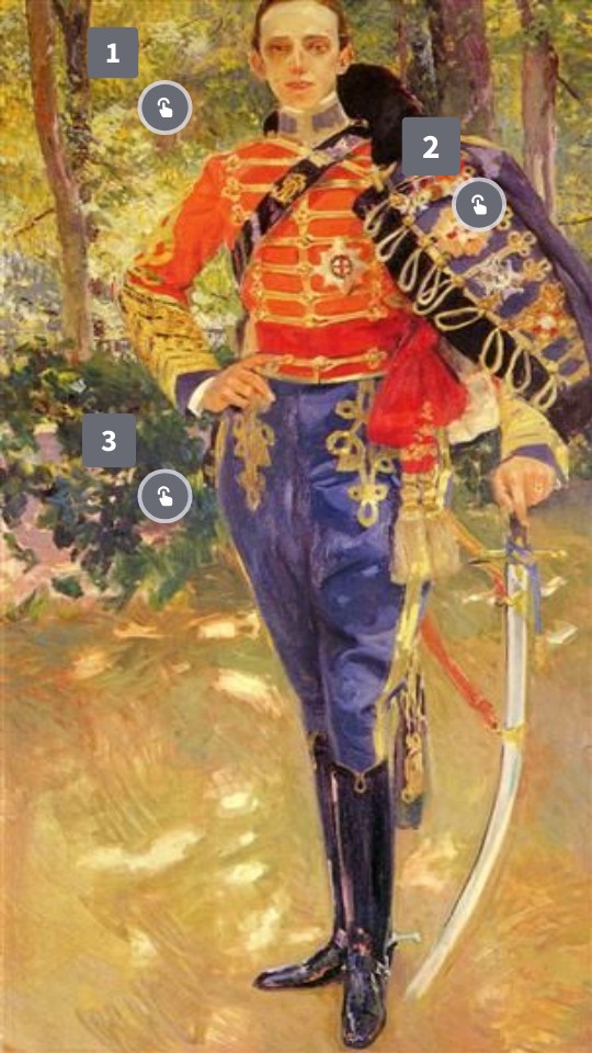Nombre el cuadro: Retrato del Rey Alfonso XIII con el uniforme de húsares Autor: José María López Mezquita Fecha y lugar: Fue pintado en 1907 en España. Museo en el que se encuentra: Este retrato se encuentra en la colección del Palacio Real de Madrid, España.