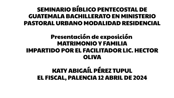 SEMINARIO BÍBLICO PENTECOSTAL DE GUATEMALA BACHILLERATO EN MINISTERIO PASTORAL URBANO MODALIDAD RESIDENCIAL Presentación de exposición MATRIMONIO Y FAMILIA IMPARTIDO POR EL FACILITADOR LIC. HECTOR OLIVA KATY ABIGAÍL PÉREZ TUPUL EL FISCAL, PALENCIA 12 ABRIL DE 2024