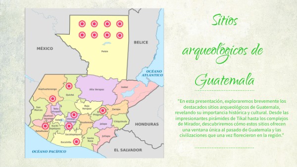 "En esta presentación, exploraremos brevemente los destacados sitios arqueológicos de Guatemala, revelando su importancia histórica y cultural. Desde las impresionantes pirámides de Tikal hasta los complejos de Mirador, descubriremos cómo estos sitios ofrecen una ventana única al pasado de Guatemala y las civilizaciones que una vez florecieron en la región."
