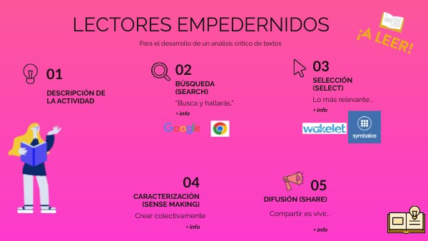 Para esta actividad, haremoms una curación de contenido sobre los hábitos de lectura en España y el teatro. Estos son contenidos esenciales de la asignatura de Lengua Castellana y Literatura para el curso de 1.º de ESO. Los pasos a seguir son:
