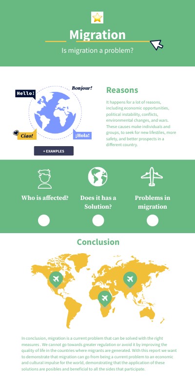 In conclusion, migration is a current problem that can be solved with the right measures . We cannot go towards greater regulation or avoid it by improving the quality of life in the countries where migrants are generated. With this report we want to demonstrate that migration can go from being a current problem to an economic and cultural impulse for the world, demonstrating that the application of these solutions are posibles and beneficial to all the sides that participate.