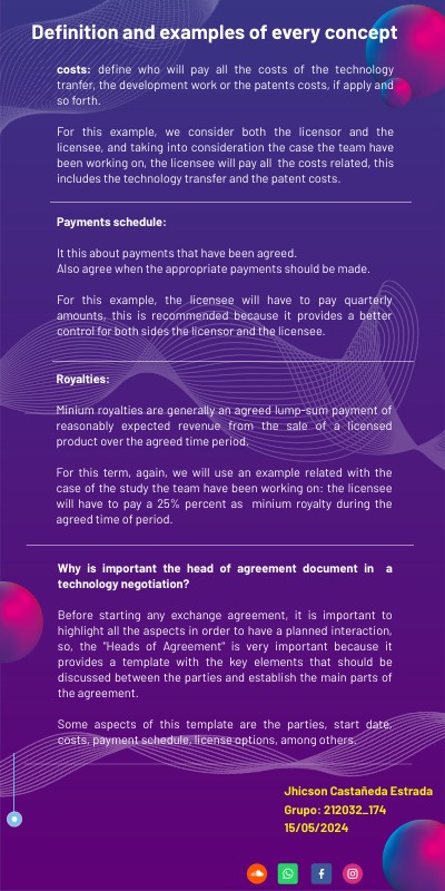 costs: define who will pay all the costs of the technology tranfer, the development work or the patents costs, if apply and so forth. For this example, we consider both the licensor and the licensee, and taking into consideration the case the team have been working on, the licensee will pay all the costs related, this includes the technology transfer and the patent costs.