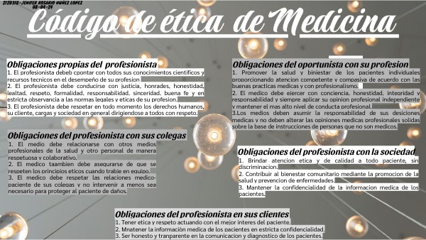 1. Promover la salud y biniestar de los pacientes individuales proporcionando atencion competente y compasiva de acuerdo con las buenas practicas medicas y con profesionalismo.2. El medico debe ejercer con conciencia, honestidad, integridad y responsabilidad y siempre aplicar su opinion profesional independiente y mantener el mas alto nivel de conducta profesional. 3.Los medios deben asumir la responsabilidad de sus desiciones medicas y no deben alterar las opiniones medicas profesionales solidas sobre la base de instrucciones de personas que no son medicos.