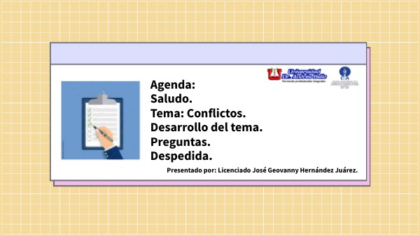 Agenda: Saludo. Tema: Conflictos. Desarrollo del tema. Preguntas. Despedida.