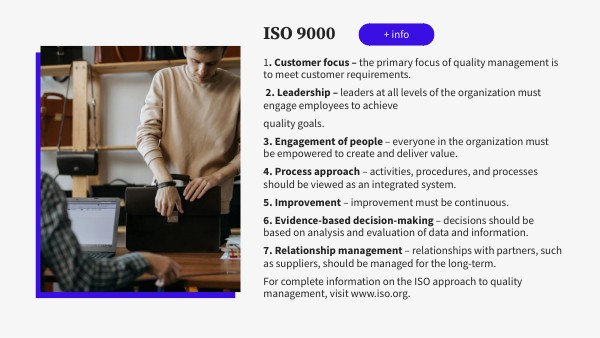 1. Customer focus – the primary focus of quality management is to meet customer requirements. 2. Leadership – leaders at all levels of the organization must engage employees to achievequality goals. 3. Engagement of people – everyone in the organization must be empowered to create and deliver value. 4. Process approach – activities, procedures, and processes should be viewed as an integrated system. 5. Improvement – improvement must be continuous. 6. Evidence-based decision-making – decisions should be based on analysis and evaluation of data and information. 7. Relationship management – relationships with partners, such as suppliers, should be managed for the long-term. For complete information on the ISO approach to quality management, visit www.iso.org.