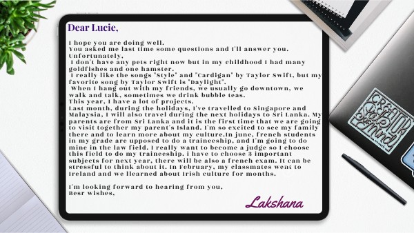 I hope you are doing well. You asked me last time some questions and I'll answer you. Unfortunately, I don't have any pets right now but in my childhood I had many goldfishes and one hamster. I really like the songs "Style" and "Cardigan" by Taylor Swift, but my favorite song by Taylor Swift is "Daylight". When I hang out with my friends, we usually go downtown, we walk and talk, sometimes we drink bubble teas. This year, I have a lot of projects. Last month, during the holidays, I've travelled to Singapore and Malaysia, I will also travel during the next holidays to Sri Lanka. My parents are from Sri Lanka and it is the first time that we are going to visit together my parent's Island. I'm so excited to see my family there and to learn more about my culture.In june, french students in my grade are upposed to do a traineeship, and I'm going to do mine in the law field. I really want to become a judge so I choose this field to do my traineeship. i have to choose 3 important subjects for next year, there will be also a french exam. It can be stressful to think about it. In February, my classmates went to Ireland and we llearned about Irish culture for months. I'm looking forward to hearing from you, Besr wishes,