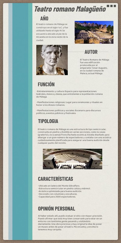 -Ubicado en ladera del Monte Gibralfaro. -Estructura semicircular en piedra caliza y mármol. -Acústica optimizada para buena audición. -Decorado con columnas y esculturas. -Capacidad para 2000 espectadores.