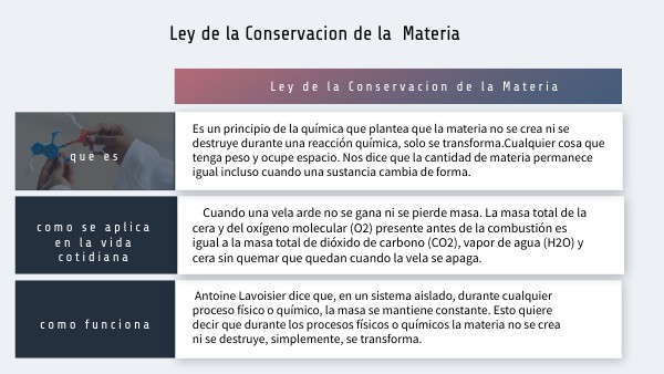 Es un principio de la química que plantea que la materia no se crea ni se destruye durante una reacción química, solo se transforma.Cualquier cosa que tenga peso y ocupe espacio. Nos dice que la cantidad de materia permanece igual incluso cuando una sustancia cambia de forma.