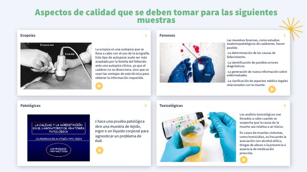 1-Muestras Patológicas: Comino, S. (2022, diciembre 9). Preparación de muestras para anatomía patológica. Ifevet Streaming Auxiliares. https://aux.streaming.ifevet.com/preparacion-de-muestras-para-anatomia-patologica/ 2-Muestras Forenses, Ecopsias y Toxicológicas: Medac Aventura 2024-Muestras de patología forense, toxicológicas y ecopsias