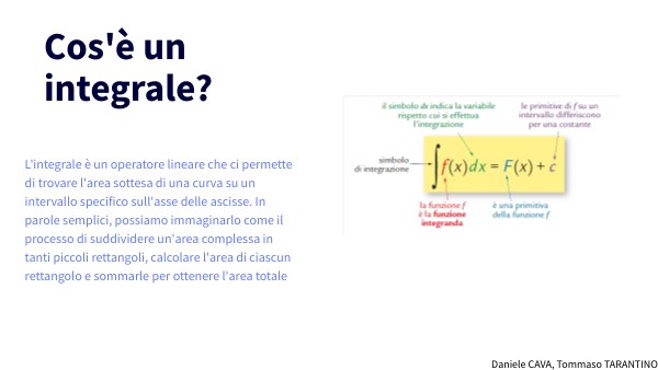 L'integrale è un operatore lineare che ci permette di trovare l'area sottesa di una curva su un intervallo specifico sull'asse delle ascisse. In parole semplici, possiamo immaginarlo come il processo di suddividere un'area complessa in tanti piccoli rettangoli, calcolare l'area di ciascun rettangolo e sommarle per ottenere l'area totale