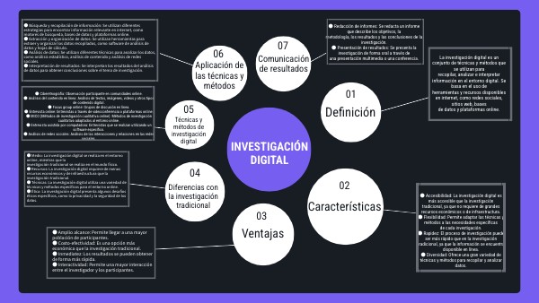 ● Medio: La investigación digital se realiza en el entorno online, mientras que lainvestigación tradicional se realiza en el mundo físico.● Recursos: La investigación digital requiere de menos recursos económicos y de infraestructura que la investigación tradicional. ● Técnicas: La investigación digital utiliza una variedad de técnicas y métodos específicos para el entorno online. ● Ética: La investigación digital presenta algunos desafíos éticos específicos, como la privacidad y la seguridad de los datos.