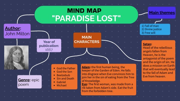 Satan:Head of the rebellious angels fallen from Heaven, he is the antagonist of the poem and the origin of sin. He does a mission on Earth that will eventually lead to the fall of Adam and Eve from heaven.