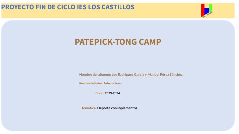 Patepick-tong camp es una idea desarrollada por dos alumnos amantes y conocedores de los campamentos de verano y los deportes con implementos, es por eso que queremos juntar estos dos mundos que tanto nos gustan. Un campamento al más puro estilo tradicional con sus hogueras, sus tiendas de campaña, sus gymkanas y sus juegos mezclado con un campamento de deporte con implementos. Creemos que esta combinación será perfecta para el desarrollo personal y social de toda la gente que participe en el campamento. Las actividades que realizaremos estarán sobre todo enfocadas en los deportes con implementos, teniendo sobre todo los primeros dias clases mas paradas donde explicaremos las nociones básicas de estos, a parte el dia estara dividido de tal forma que realizaremos actividades de ocio, talleres y demás. Por las noches también realizaremos veladas y juegos divertidos para los niños. Sabemos que ya existen muchos campamentos deportivos y también muchos campamentos tradicionales, por eso quereemos darle una vuelta y realizar un campamento con el que todo el mundo se sienta identificado y agusto.