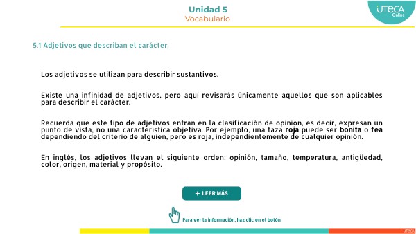 Los adjetivos se utilizan para describir sustantivos. Existe una infinidad de adjetivos, pero aquí revisarás únicamente aquellos que son aplicables para describir el carácter. Recuerda que este tipo de adjetivos entran en la clasificación de opinión, es decir, expresan un punto de vista, no una característica objetiva. Por ejemplo, una taza roja puede ser bonita o fea dependiendo del criterio de alguien, pero es roja, independientemente de cualquier opinión. En inglés, los adjetivos llevan el siguiente orden: opinión, tamaño, temperatura, antigüedad, color, origen, material y propósito.