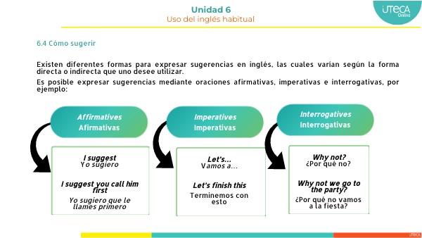 Revisa el siguiente video para aprender más sobre cómo hacer sugerencias en inglés. Observa hasta el minuto 7:00. Oxford Online English. (2020, 19 de noviembre). Making Suggestions in English - Spoken English Lesson. [video]. Youtube. https://youtu.be/7wT7BzAoyj0?si=6P8espmcTLA0OixZ