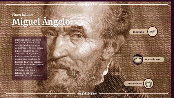 Michelangelo di Lodovico Buonarroti Simoni, mais conhecido simplesmente como Miguel Ângelo, foi um pintor, escultor, poeta, anatomista e arquiteto italiano, considerado um dos maiores criadores da história da arte do ocidente. Nasceu no dia 6 de março de 1475 em Caprese Michelangelo, Itália e faleceu no dia 18 de fevereiro de 1564 em Roma.