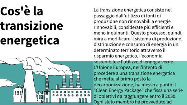 La transizione energetica consiste nel passaggio dall’utilizzo di fonti di produzione non rinnovabili a energie rinnovabili, considerate più efficienti e meno inquinanti. Questo processo, quindi, mira a modificare il sistema di produzione, distribuzione e consumo di energia in un determinato territorio attraverso il risparmio energetico, l'economia sostenibile e l'utilizzo di energia verde. L’Unione Europea, nell’intento di procedere a una transizione energetica che mette al primo posto la decarbonizzazione, ha messo a punto il "Clean Energy Package" che fissa una serie di obiettivi da raggiungere entro il 2030. Ogni stato membro ha provveduto ad elaborare un Piano Nazionale Integrato per l'Energia e il Clima (PNIEC) che stabilisce i passi necessari e le politiche da attuare per raggiungere, nel periodo 2021-2030, i traguardi stabiliti dalla Comunità Europea.