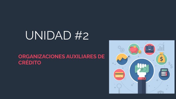 2.3. Organizaciones Auxiliares del Crédito2.3.1. Concepto 2.3.2. Clasificación2.3.2.1. ALMACENES GENERALES DE DEPÓSITO Concepto Características2.3.2.2. ARRENDADORAS FINANCIERAS Concepto Características2.3.2.3. FACTORAJE FINANCIERO Concepto Características2.3.2.4. UNIONES DE CRÉDITO Concepto Características2.3.2.5. CASAS DE CAMBIO Concepto