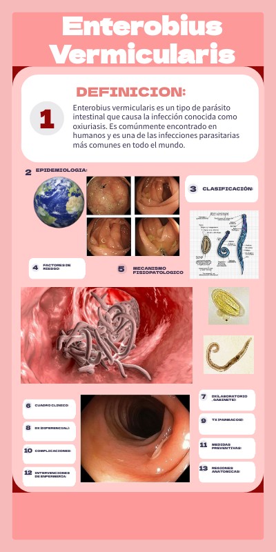 Enterobius vermicularis es un tipo de parásito intestinal que causa la infección conocida como oxiuriasis. Es comúnmente encontrado en humanos y es una de las infecciones parasitarias más comunes en todo el mundo.