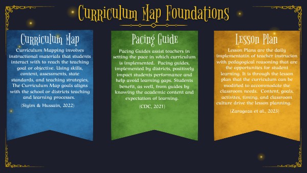 Curriculum Mapping involves instructional materials that students interact with to reach the teaching goal or objective. Using skills, content, assessments, state standards, and teaching strategies, The Curriculum Map goals aligns with the school or districts teaching and learning processes. (Siyim & Hussain, 2022)