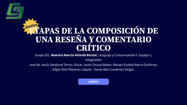 Grupo 201. Maestra Marcia Velarde Bernal. Lenguaje y Comunicación II. Equipo 1.IntegrantesJosé de Jesús Sandoval Torres. Oscar Javier Osuna Valdez. Moises Erubiel Ibarra Gutiérrez. Edgar Alan Martinez Jaques. Dante Alan Cardenas Vargas.