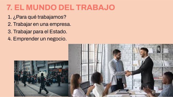 1. ¿Para qué trabajamos? 2. Trabajar en una empresa. 3. Trabajar para el Estado. 4. Emprender un negocio.