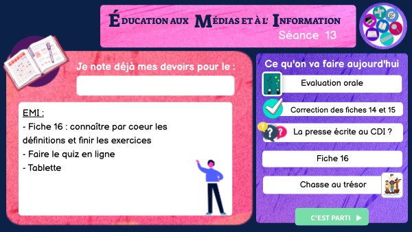 EMI : - Fiche 16 : connaître par coeur les définitions et finir les exercices - Faire le quiz en ligne - Tablette