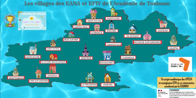Le projet académique des UPE2A, coordonné par le CASNAV, vise à accompagner les élèves allophones du 1er et 2ème degré de l'académie de Toulouse dans leur parcours éducatif. Cette année, le thème de la simulation globale est le village. Les élèves, en collaboration avec leurs enseignants en dispositif d'UPE2A, ont créé des villages fictifs, en élaborant le décor de leur village et en imaginant des identités fictives qui y habitent.