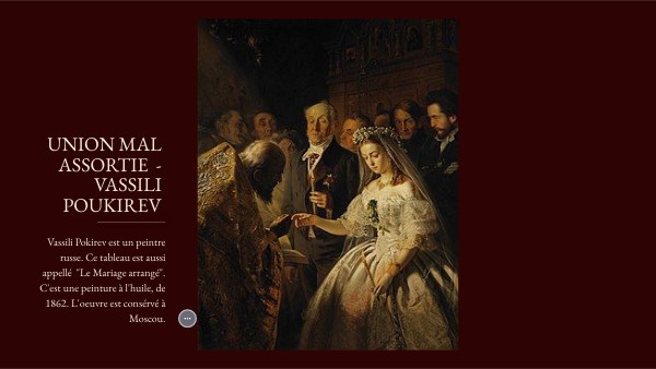 Comme le montre le titre "Union mal assortie" ou encore "Le Mariage arrangé", dans cette œuvre se cache un regard qui exprime à la fois la résignation et la tristesse face à un mariage arrangé et inégalitaire. Le tableau montre une scène de mariage suivant le rite de l'Eglise orthodoxe. On remarque principalement 3 personnages: le marié, la mariée et la prêtre