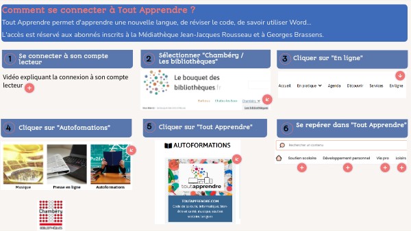 Tout Apprendre permet d'apprendre une nouvelle langue, de réviser le code, de savoir utiliser Word... L'accès est réservé aux abonnés inscrits à la Médiathèque Jean-Jacques Rousseau et à Georges Brassens.