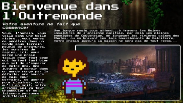 Vous, l'humain, vous voilà dans une belle misère...vous venez de pénétrez dans un monde sous terrain peuplé de créatures, les monstres de magies, ici, vous serez une proie facile pour tout ceux qui tentent tant bien que mal de s'emparer de votre âme. Une lueurre d'espoir dans un monde rongé par la défaite, une source de paix pour certains, de guerre pour d'autres, quoi qu'il en soit, votre arrivée ici va tout chambouler et ne laissera personne indifférent.